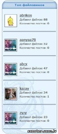 Здравствуйте. Информер топ файловиков,для юкоза. Заходим в Админ понель далее создаем информер>Пользователи>Материалы>Кол. файлов >Материалы: 5 >Колонки: 1 В дизайн информера вставляем