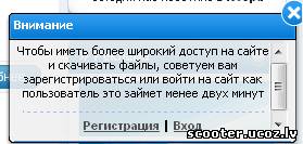 <?if($USER_LOGGED_IN$)?><?else?> <script type="text/javascript">data = 'Чтобы иметь более широкий доступ на сайте и скачивать файлы, советуем вам зарегистрироваться или войти на сайт как пользователь это займет менее двух минут<div style="padding:5px;"><hr><b><a href="/index/3">Регистрация</a> | <a href="/index/1">Вход</a></b></div>';