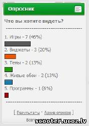 Установка: 1. Скачиваем архив ниже. 2. Через файловый менеджер загружаем папку "question_images" в корень вместе со всеми файлами. 3. Вставляем код формы опроса в Управление дизайном » Опросы » Вид формы опросов. 4. Сохраняем. 5. НЕ ЗАБУДЬТЕ СКАЧАТЬ ПАПКУ С КАРТИНКАМИ. ПРЯМОЙ ЛИНК http://narod.ru/disk/63549713001.6bc9ec6a9fd5e507f23532bbd8132a89/question_images.rar.html